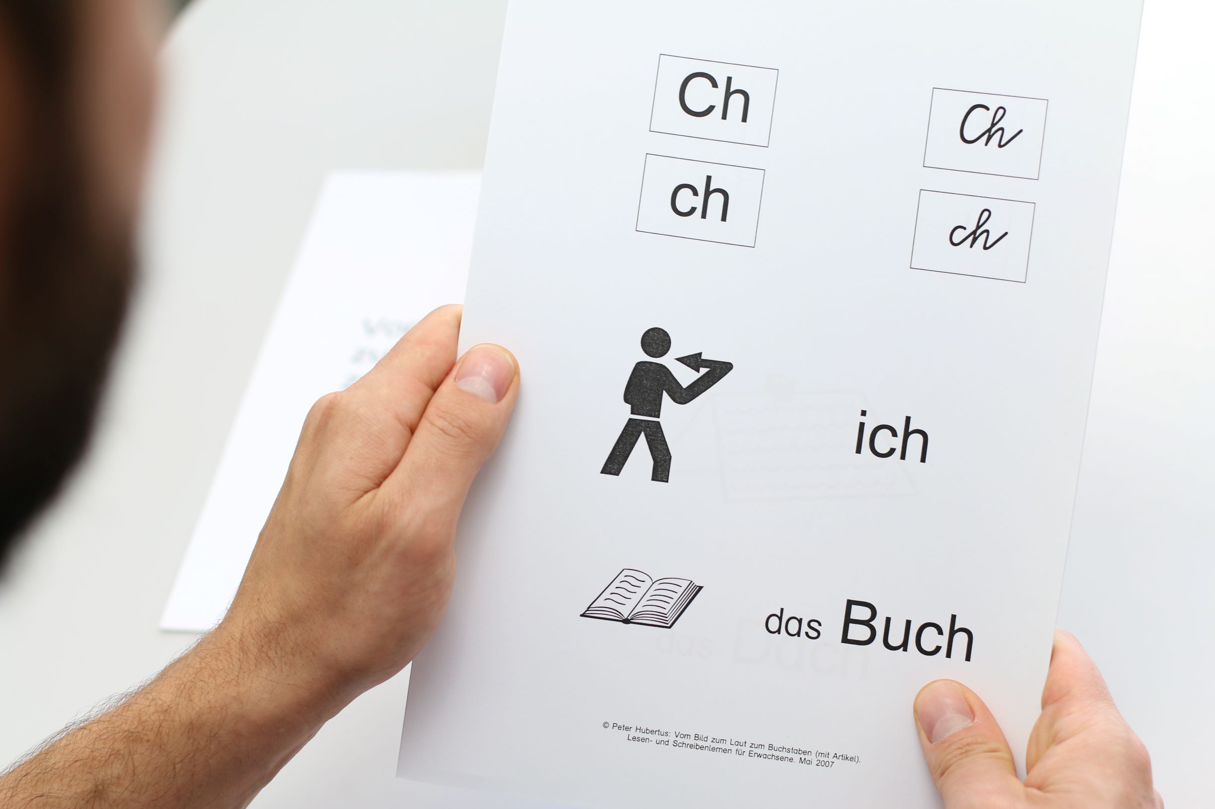 Das Unterrichtsmaterial ist auch für das Verschriften erster Wörter geeignet: Wenn der Lerner wissen will, mit welchem Buchstaben das Wort "Tomate" geschrieben wird, helfen ihm die Bilder, das Wort "Tasse" zu finden, das mit demselben Laut [t] beginnt und dem der Buchstabe "T/t" zugeordnet ist.